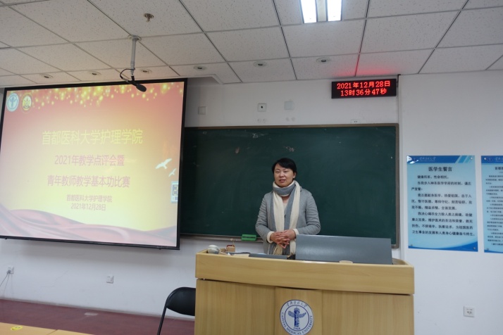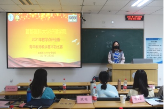 为培养青年教师爱岗敬业、严谨治学的态度,激发青年教师更新教育理念和掌握现代教学方法的热情,进一步推进课程思政建设,护理学院于2021年12月28日下午,在校本部第一教学楼510教室举办了2021年教学点评会暨青年教师教学基本功比赛。本次比赛由专家评委和学生评委组成,校、院两级教学督导赵素梅老师、北京市教学名师王雯教授、庞文云副院长、肖倩副院长、学系主任王艳玲副教授、岳鹏副教授、教学主管景丽伟教授到场担任专家评委,学生评委由护理学院2019级四年制护理专业5名同学担任。学校教务处武艳处长、护理学院刘均娥院长出席了比赛,全院教职工线上、线下全程观摩了比赛比赛由庞文云副院长主持。